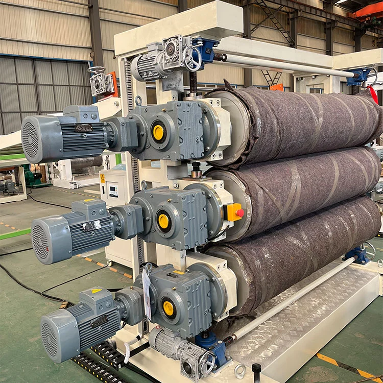 하드 플라스틱 PVC 시트 압출 라인- 수직 3 롤 캘린더링 머신 : 하나 A. 캘린더 머신의 구조 : 수직 3 롤 (롤러 안전 보호 장치 포함) 비. 롤러 수; 3 개 (Qingdao에서 생산) C. 드럼 직경 : 40mm D, 롤러 길이 : 12 0mm 이자형. 롤러의 벽 두께 : ≥2 1 mm F. 롤 재료 : 45# 스틸이 사용되며 경화 처리가 수행되고 경도가 RC60-65에 도달 할 수 있습니다. G. 롤러 표면 처리 : 미러 처리 H. 드럼 구조 : 다층 콤보 류 빠른 교환 시스템은 드럼의 균일하고 일정한 온도를 보장하기 위해 채택되었습니다. I. 롤러의 일정한 온도 매체 : 연화 된 물 J. 3 롤 제어 시스템 : 주파수 변환 제어가 동기적이고 독립적 인 속도 제어를 실현하기 위해 채택되었습니다. K, 변속기 시스템 : 1.5kwx3 = 4.5kw, 3 개의 롤러의 부드러운 작동을 보장합니다.